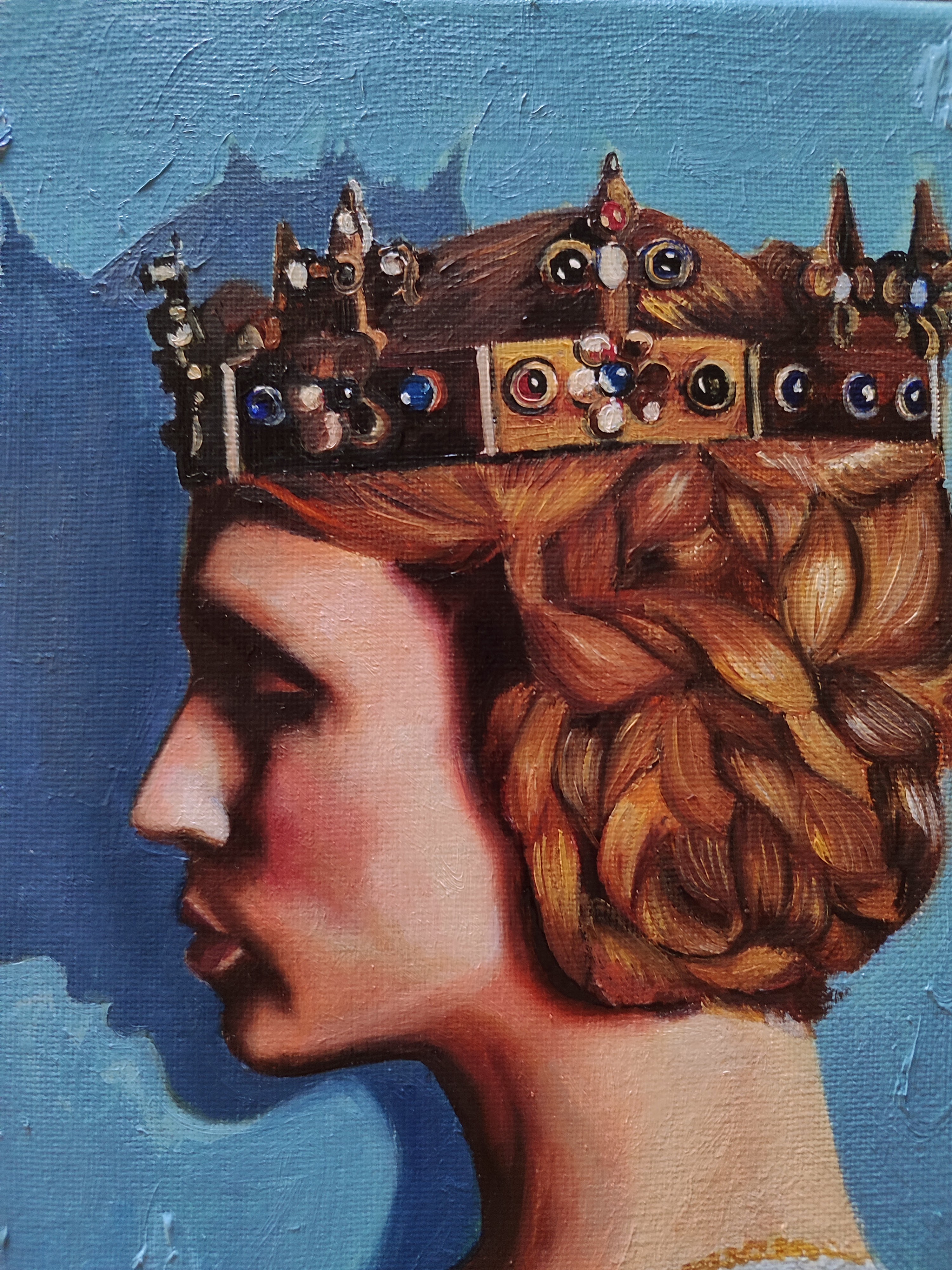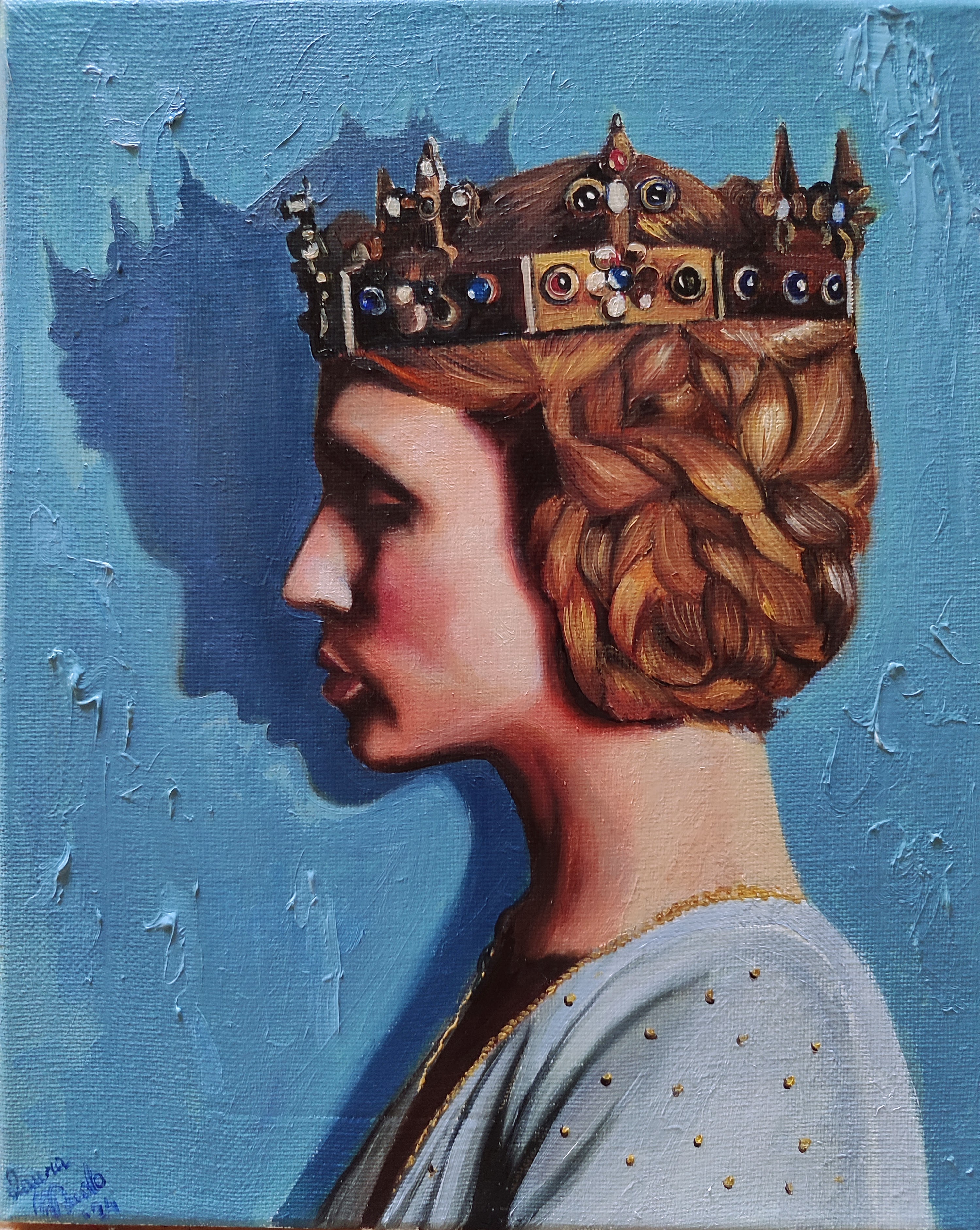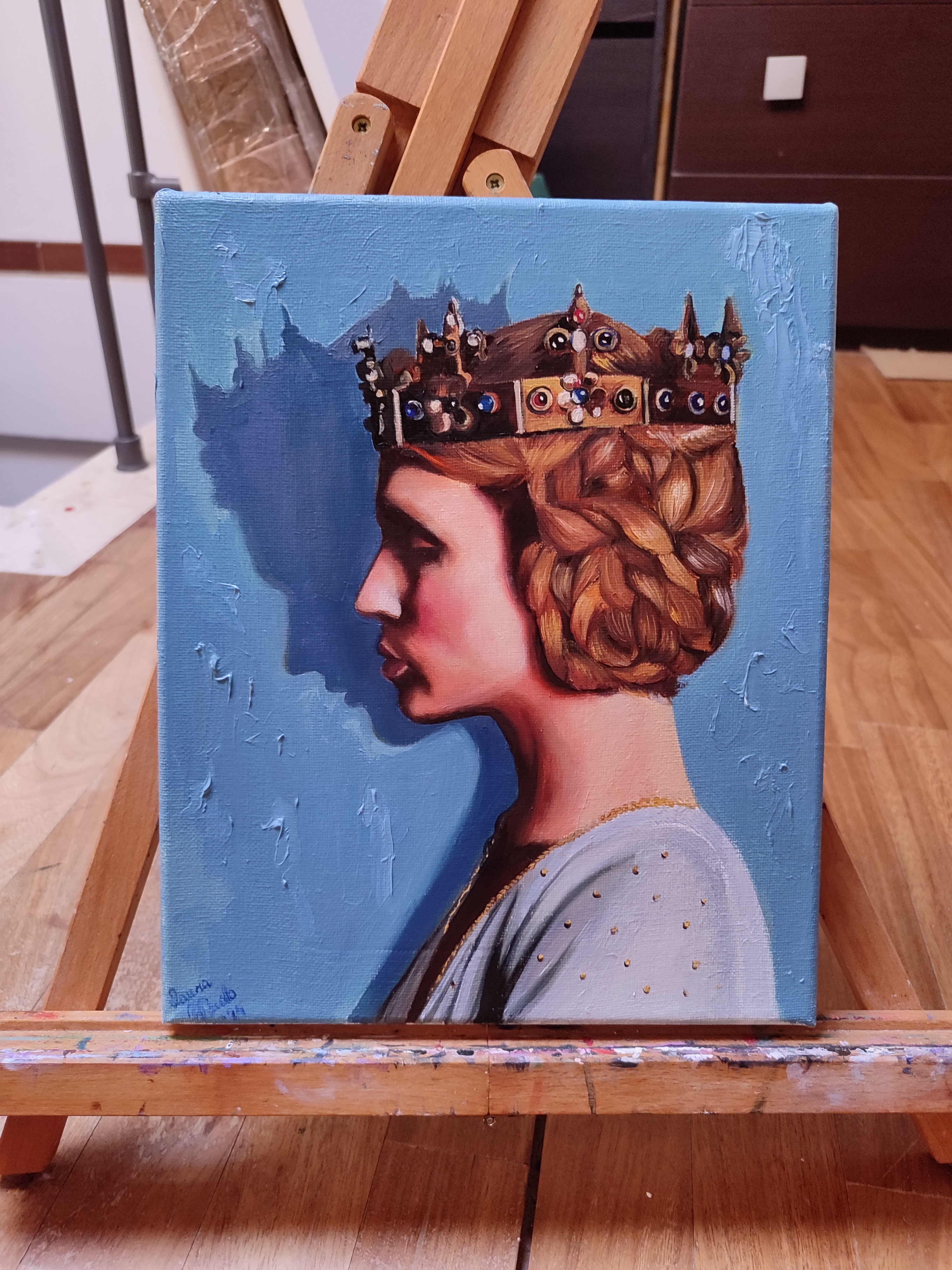 Qui ho cercato di rappresentare un pensiero, un’ansia, scegliendo come soggetto il volto di una regina. I reali appaiono sempre impeccabili, pronti per ogni evenienza, capaci di prendere decisioni di rilievo; ma è solo apparenza. Attraverso l’ombra di un profilo che guarda in basso, si può intuire il suo pensiero, la sua preoccupazione per qualcosa, come può succedere ad ognuno di noi…