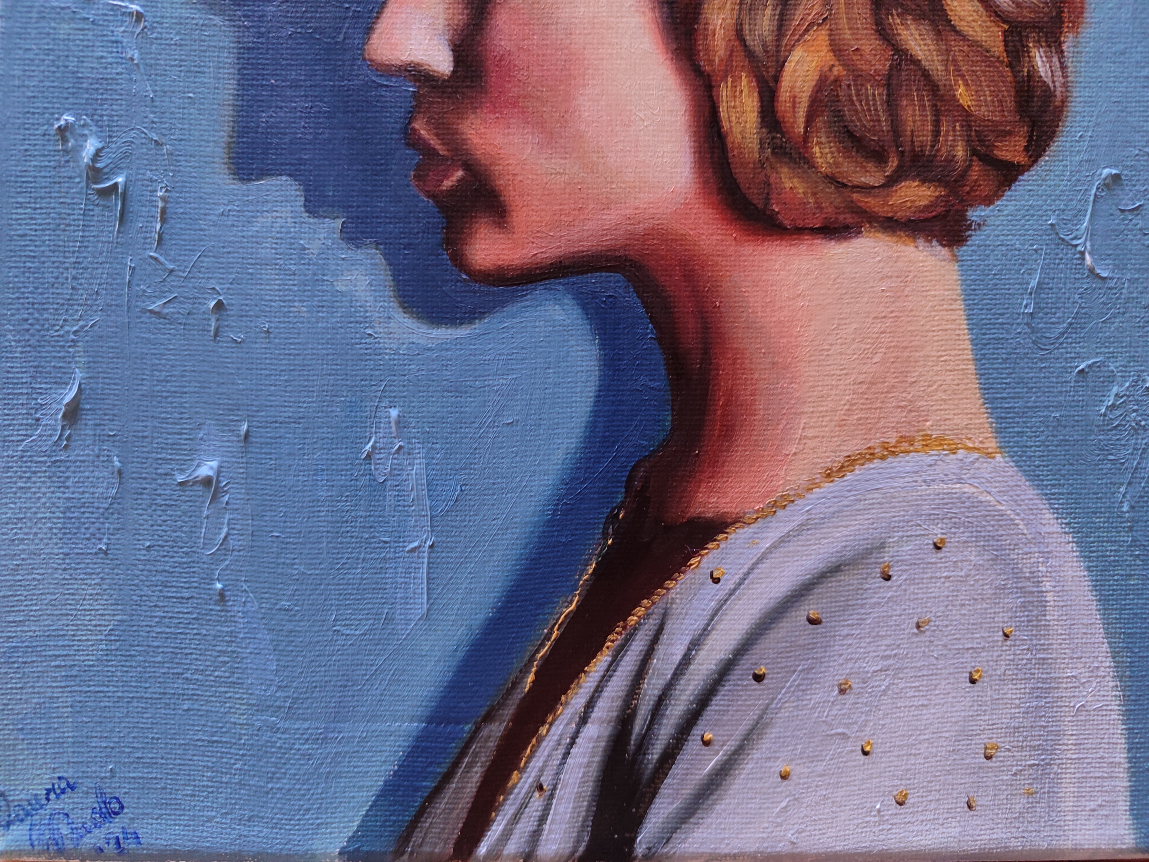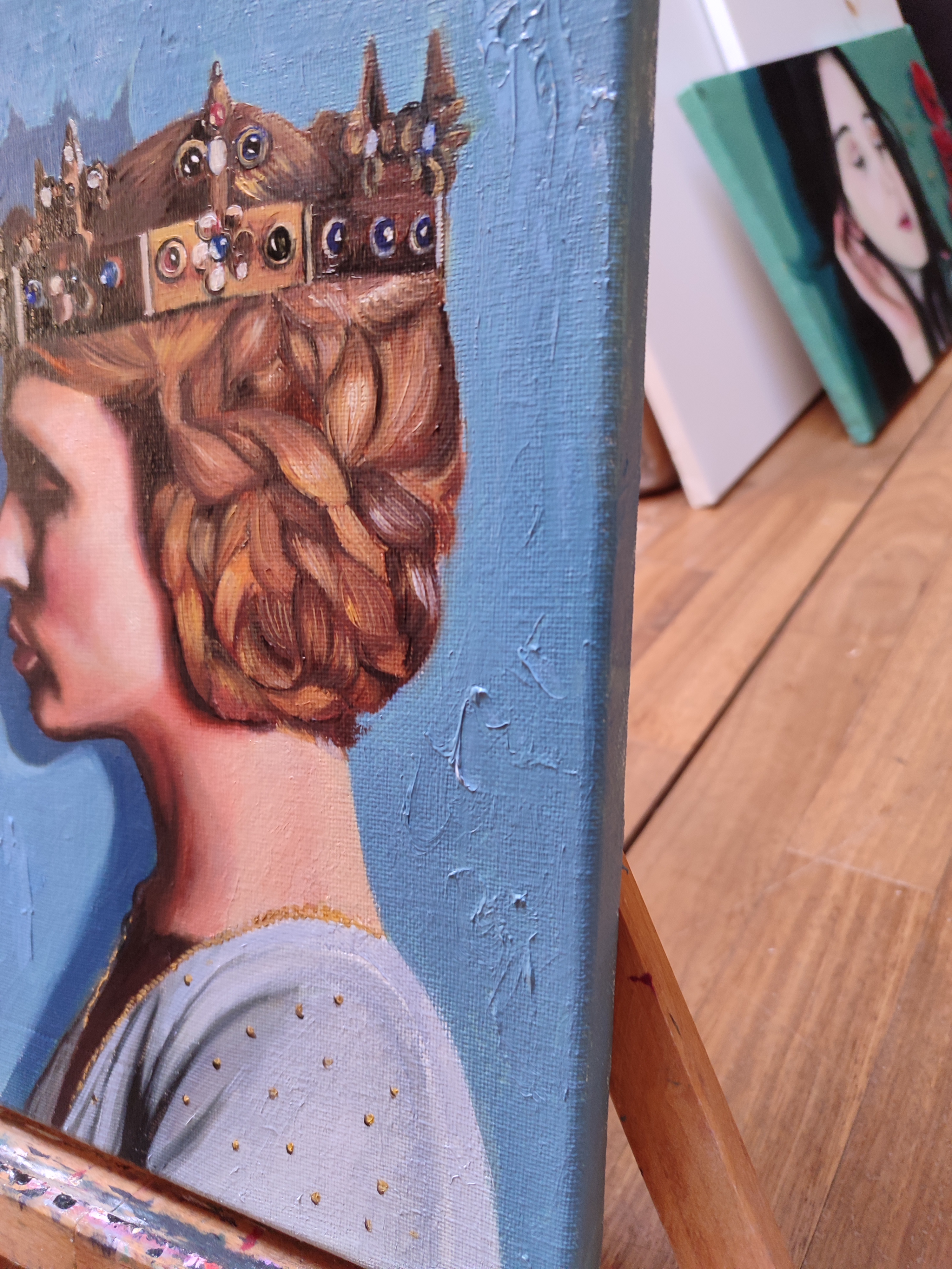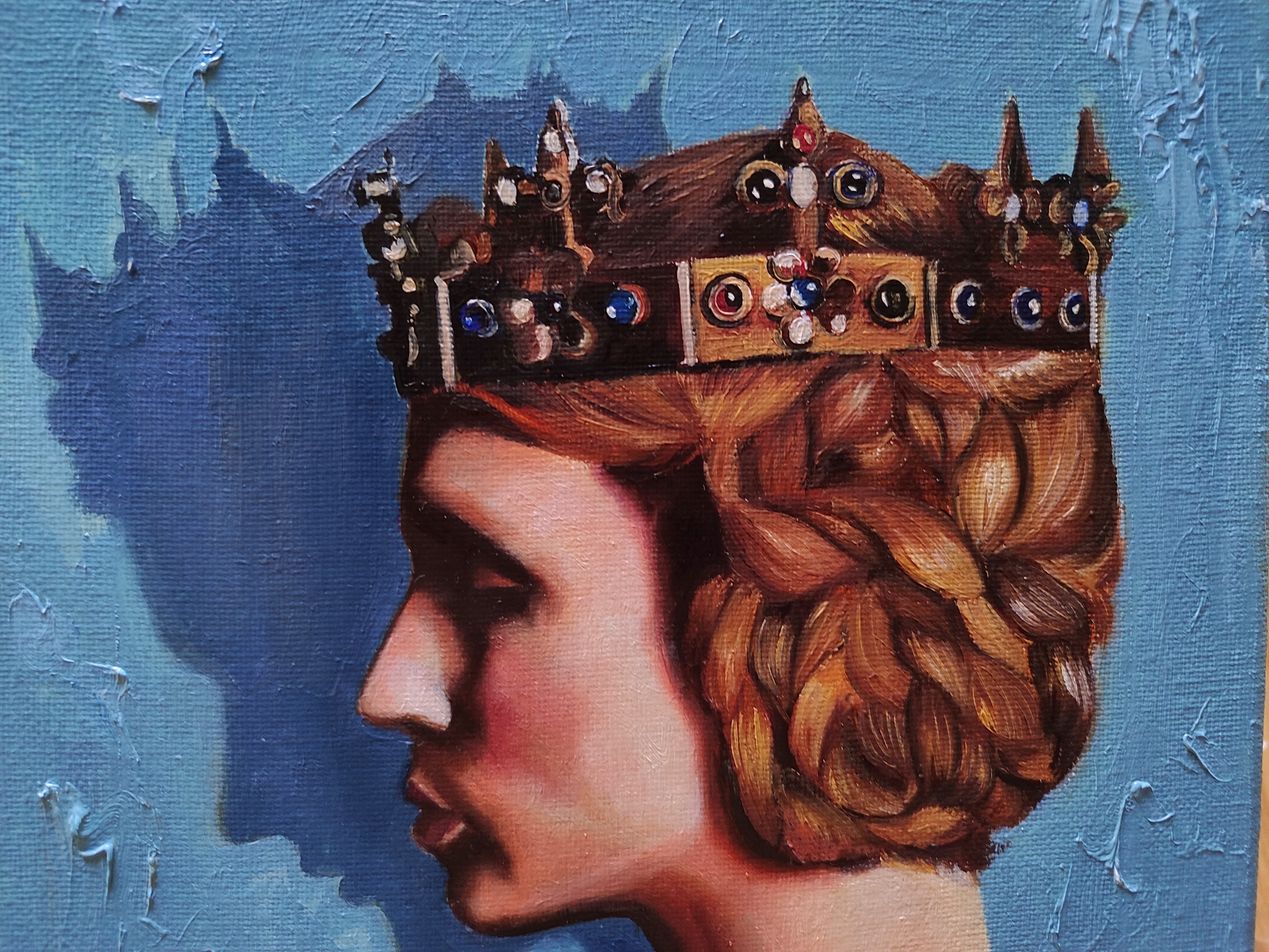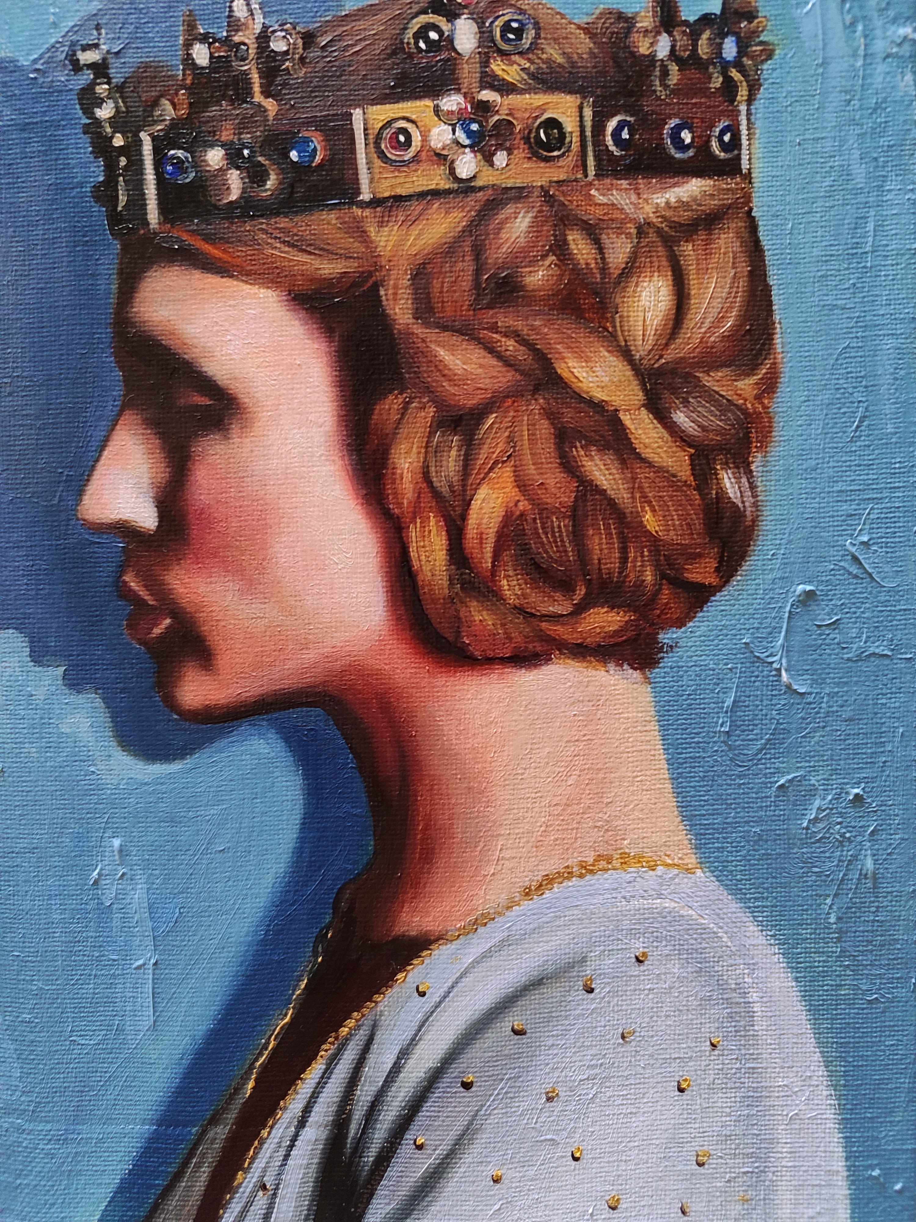 Qui ho cercato di rappresentare un pensiero, un’ansia, scegliendo come soggetto il volto di una regina. I reali appaiono sempre impeccabili, pronti per ogni evenienza, capaci di prendere decisioni di rilievo; ma è solo apparenza. Attraverso l’ombra di un profilo che guarda in basso, si può intuire il suo pensiero, la sua preoccupazione per qualcosa, come può succedere ad ognuno di noi…