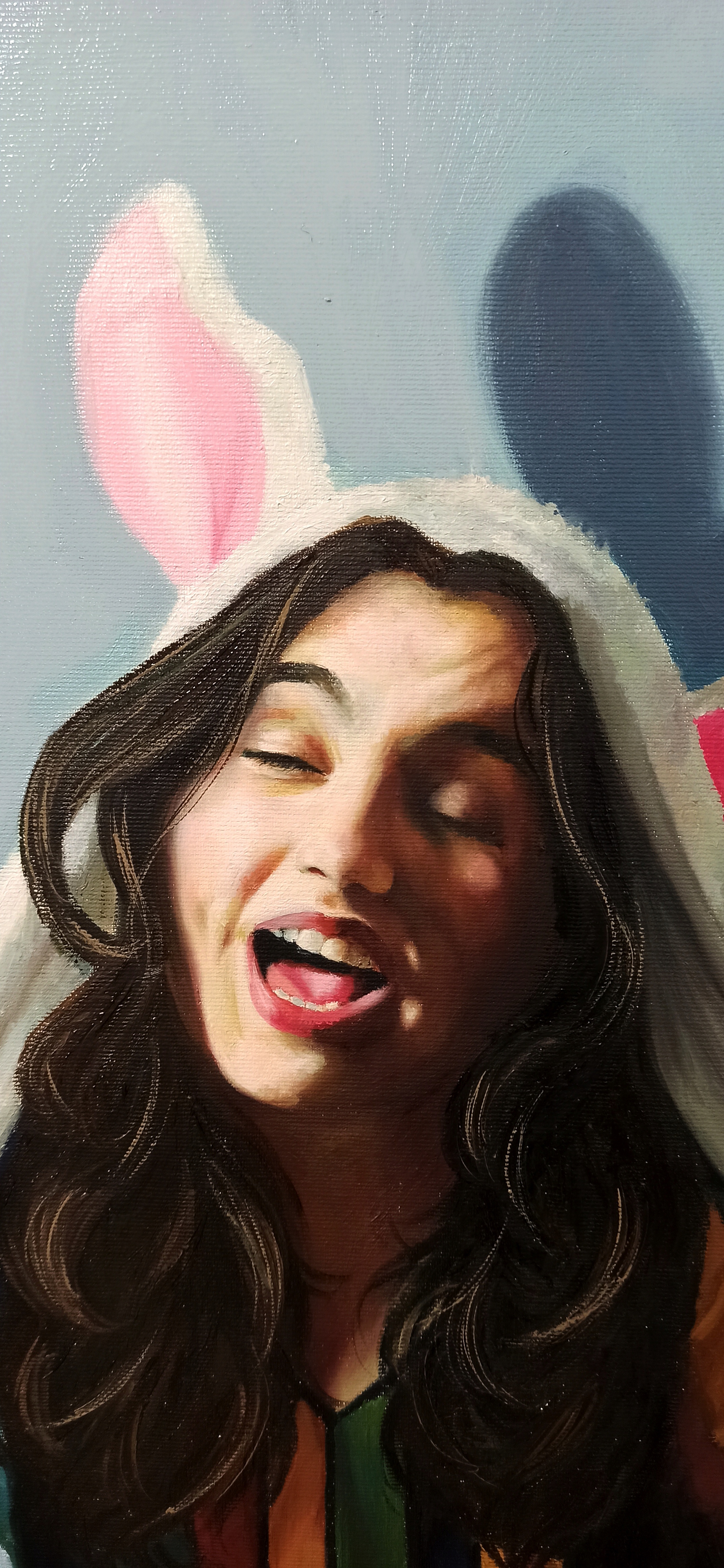 Questa simpatica ragazza, con indosso un cappellino, fa l’azione di concentrarsi , di pensare intensamente al realizzarsi del suo desiderio, e alla fine di trovare una soluzione. Il dipinto va osservato da destra verso sinistra o se vogliamo da sinistra verso destra invertendo le azioni: contentezza di pensare al proprio desiderio, pensarci intensamente e sforzarsi per la sua realizzazione.