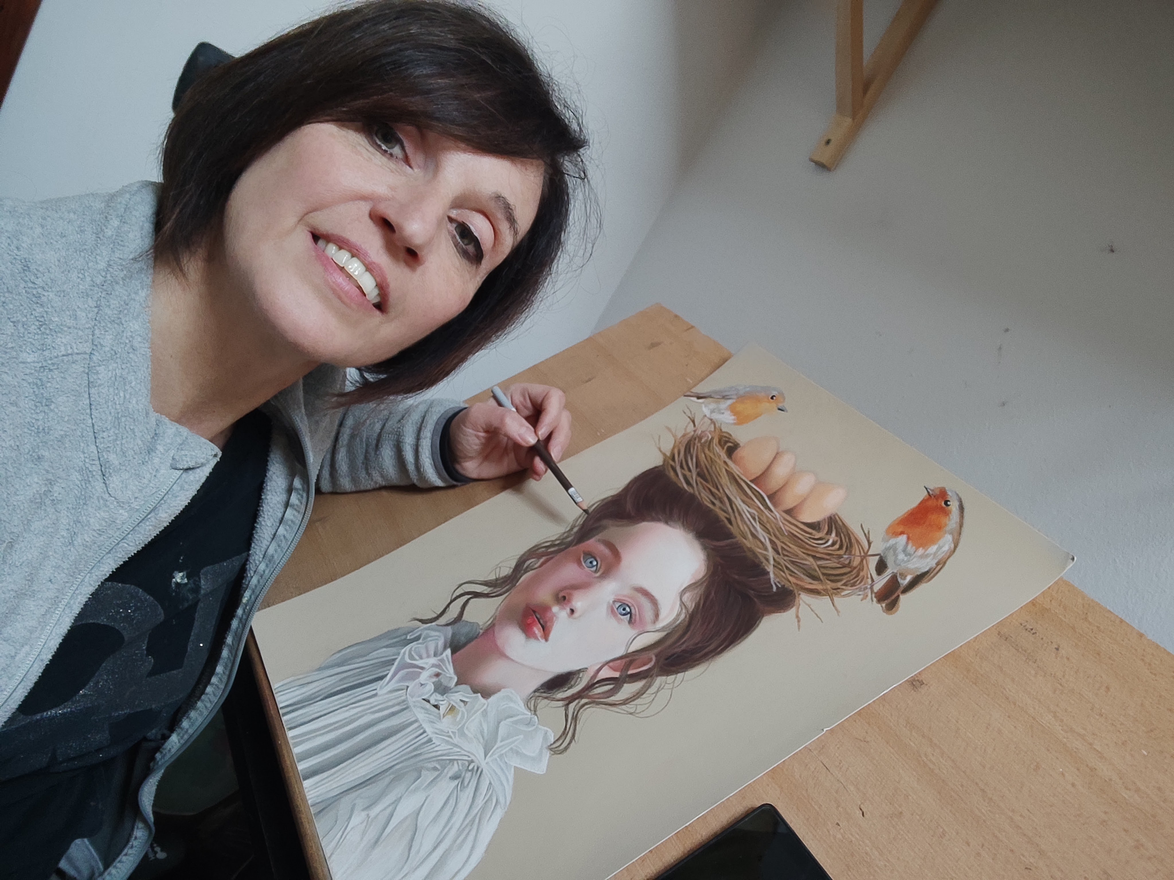 La realizzazione delle opere avviene partendo sempre da foto di soggetti giovani, scelgo un contesto, e dei simboli, a seconda della storia che voglio raccontare e poi dipinti in un’unica scena. Le sedute di pittura sono diverse: cerco di dare almeno tre passate a tutti gli elementi del dipinto, a volte, se non trovo soddisfazione, mi ritrovo a ripassare anche 5 volte il soggetto protagonista, che deve raccontare e quindi ha bisogno di essere il più possibile credibile.